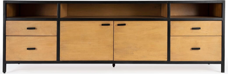 This 78” TV stand accommodates all your needs with its ample storage and clean lined design. It features four pull-out drawers with two doors opening up to an adjustable shelf and wire management hole and the solid mango wood and durable iron frame give this a mid-century appeal.Read More