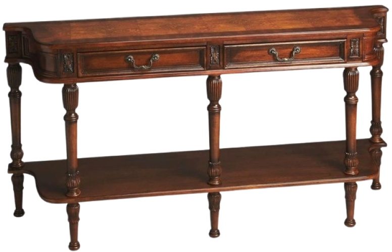 Crafted from select hardwood solids and wood products, this grand console table features inspired veneer work in cherry and ash burl with gold-tip accents, plus two drawers with complementary brass-finished hardware and a bottom display shelf. Finished in a rich olive ash burl.Read More