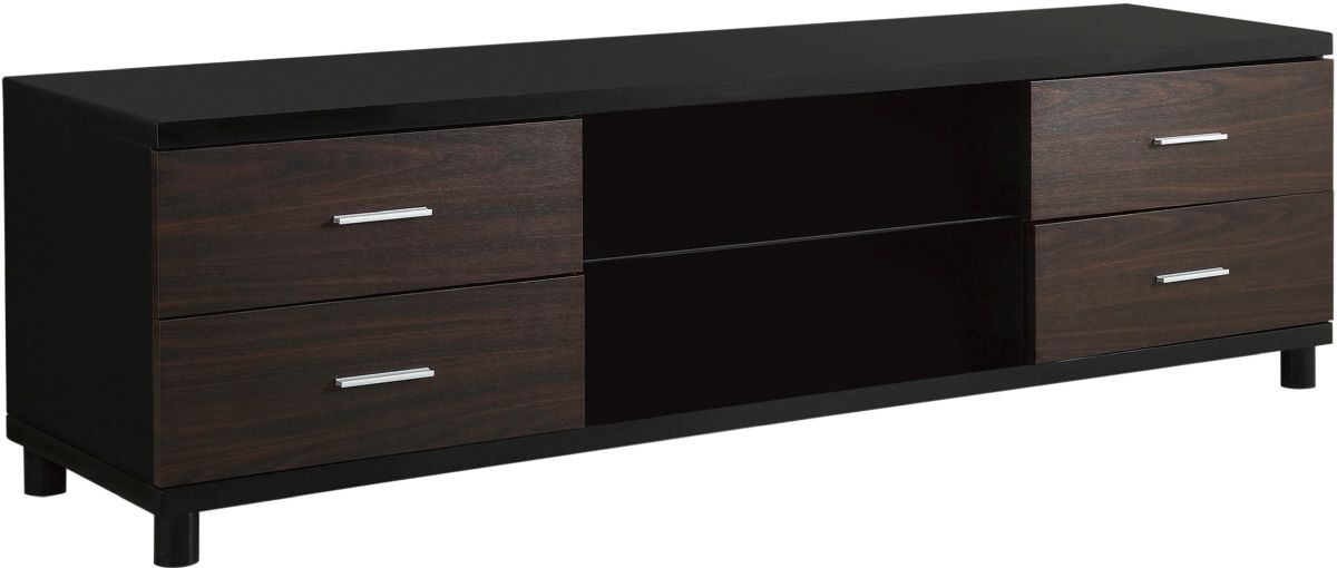 Clean lines and a classic design gracefully combine to enhance any living space. This TV console boasts a transitional aesthetic that looks elegant in a living room or den. Stylish brown drawers adorned with shining silver hardware create a pleasing contrast to its glossy black frame.Read More