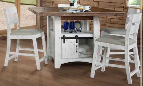 Featuring 100% solid pine. Floated panel and steel bracket construction on top for additional strength. Multi-step lacquer finish in a rubbed-white finish. Set includes Counter Height Table and 4 Barstools.Read More